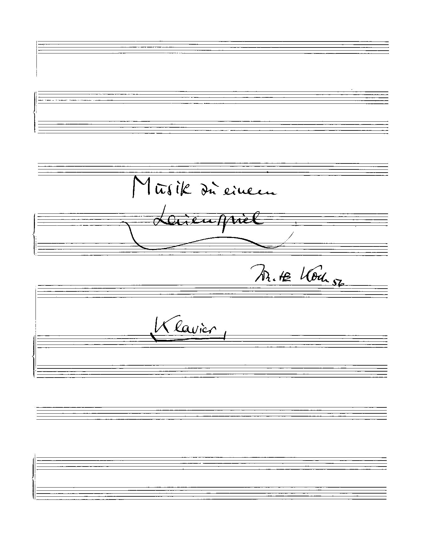 Musik zu einem Laienspiel – Ein- und Auszugsmusik und 2 Zwischenspiele zu dem Spiel: „Denn keiner ist ohne Schuld“ von Hans-Joachim Runge für Orchester (1 Fl., 1 Ob., 1 Trp. 3 Pk, Klavier und Streichquartett)
