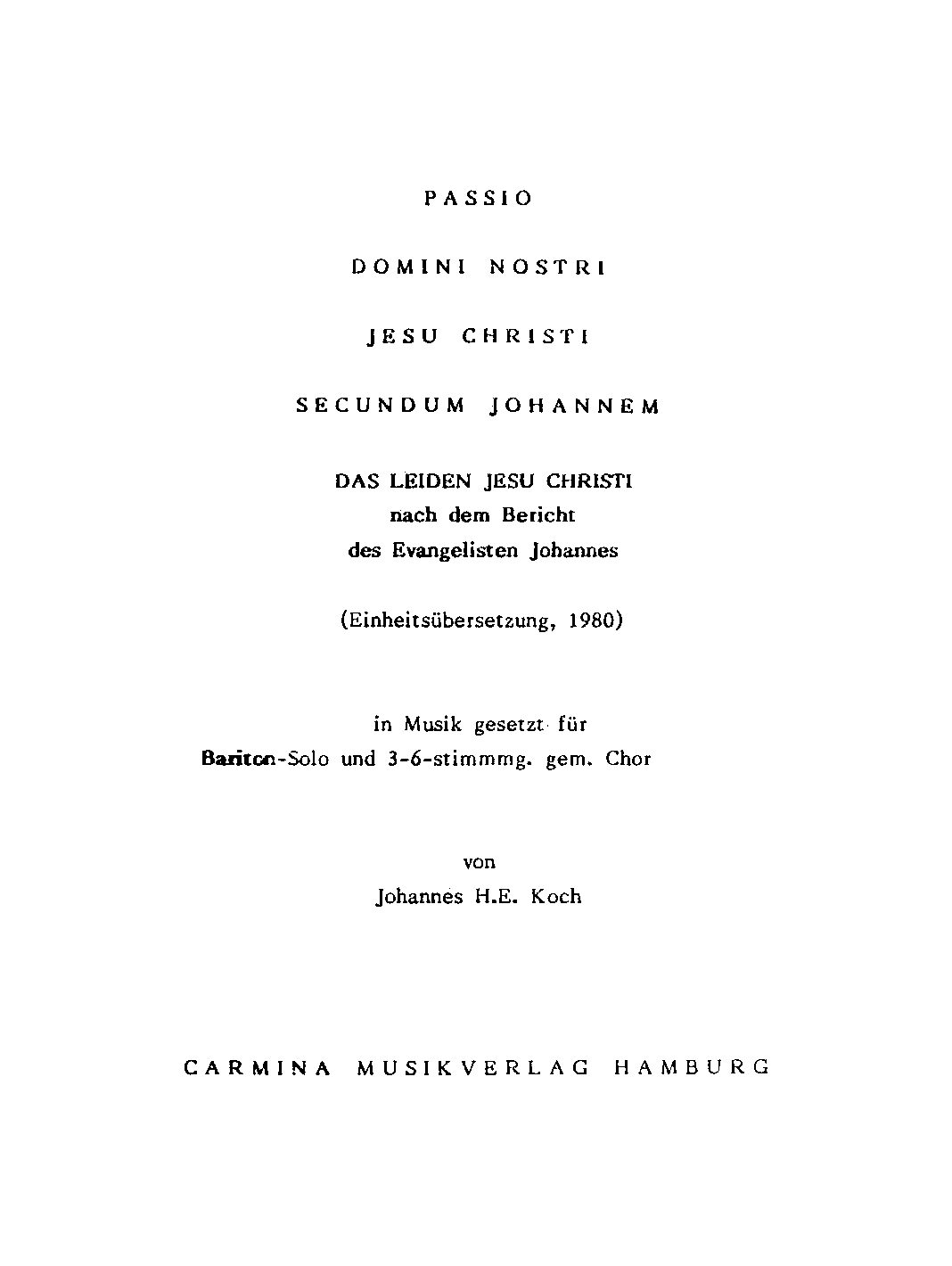 Passio domini nostri Jesu Christi secundum Johannem – Das Leiden Jesu Christi nach dem Bericht des Evangelisten Johannes (Einheitsübersetzung, 1980) in Musik gesetzt für Bariton-Solo und 3-6-stimmg. gem. Chor